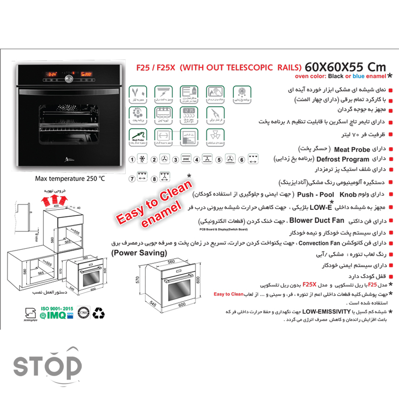 – جهت پوشش کلیه قطعات داخلی اعم از تنوره ، فر و سینی و … از لعاب Easy to Clean استفاده شده است